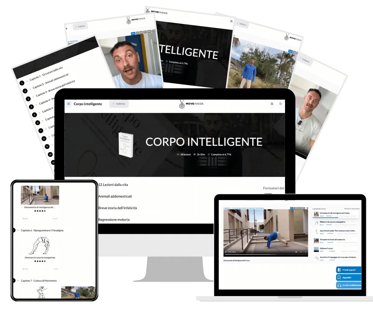 “Corpo Intelligente” è il primo libro di Crescita Personale attraverso il Movimento. Si tratta di un manuale che ti spiega in modo semplice come ripristinare la connessione tra mente e corpo e come ritrovare benessere fisico, flessibilità e forza a qualsiasi età (anche se ora sei rigido e bloccato dal dolore). Grazie a questo manuale riscoprirai la bellezza del Movimento e la Libertà che ne deriva.